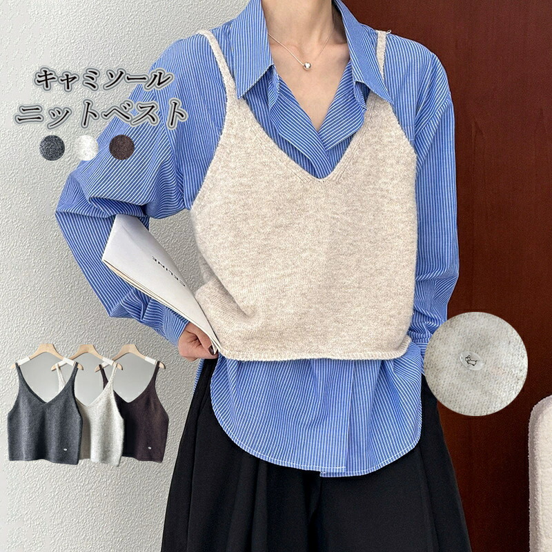 ニットベスト ビスチェ ニットキャミ ベストトップス ネックベスト ネックキャミソール レイヤード ニットジレ 袖なし ショート シンプル コーデ 通勤 通学