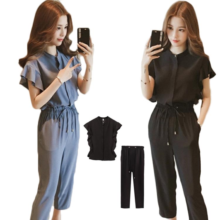 セットアップ レディース カジュアル 夏 二点セット ブラック ブルー ウエスト紐 上下2点セットブラウスクロップドパンツフレアスリーブ 可愛いフェミニン 高見え 無地 コットン 切り替え 着痩せ