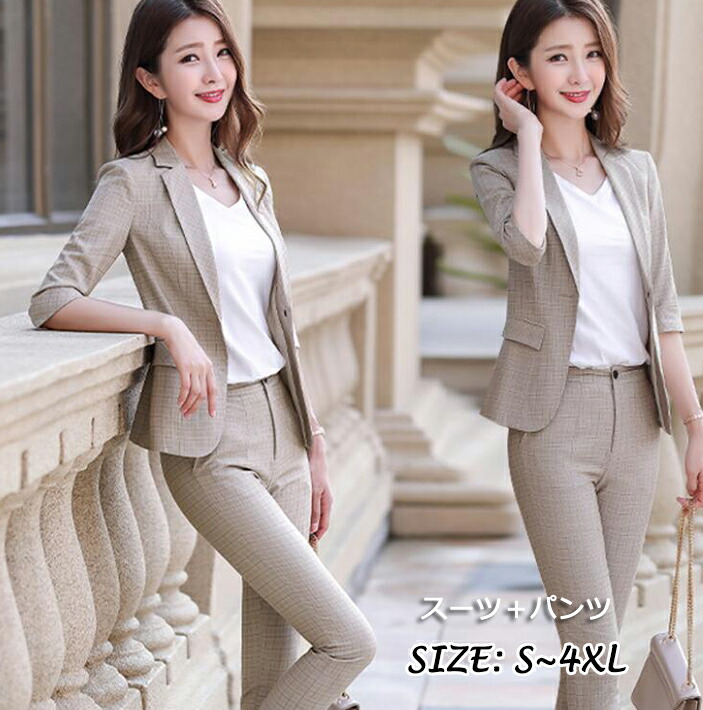 春夏秋 新着 細身タイプ ビジネススーツ2点セット ジャケット+パンツ チェック 品質良い 通勤通学 卒業式 2色 七五三 オフィス 結婚式 事務服 ビジネス ストレート カジュアル レディーススーツ
