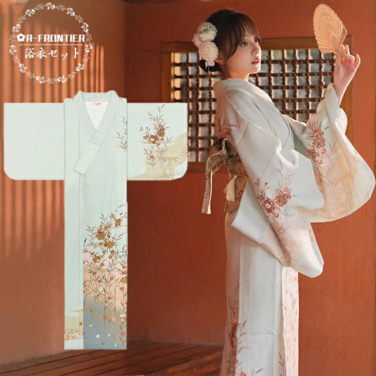 浴衣 高校生 可愛い 160 中学生 大人 レディース セット 和装 女性 緑 グリーン 浅緑 竹 花柄 洗える浴衣 作り帯 巾着袋 足袋 大きいサイズ ジュニア 花火大会 夏祭り 大きめ