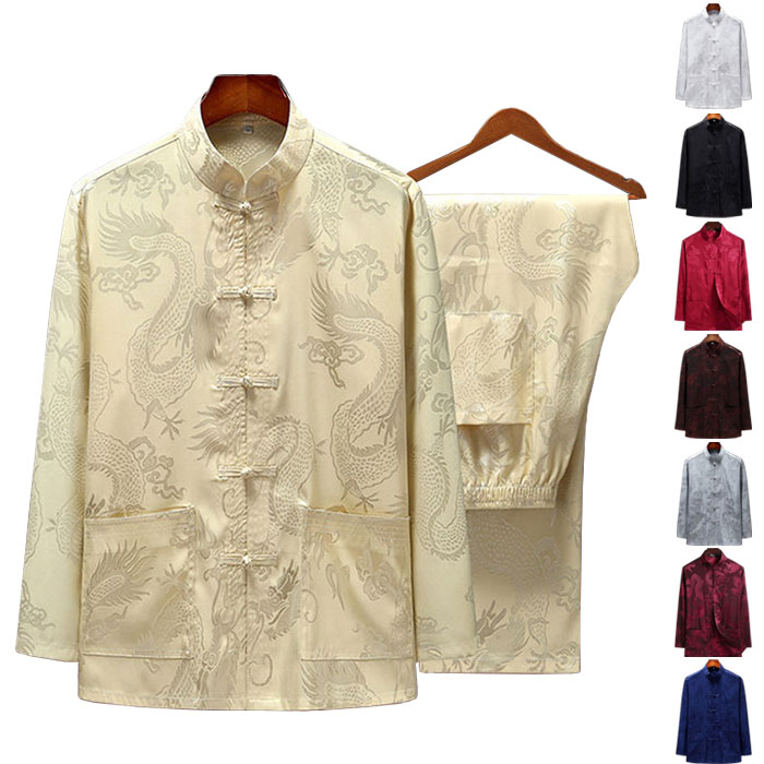 メンズ中華服 上下セット 全8色 トップス 長袖 前開き 春夏 涼感 チャイナボタン 龍刺繍 ロングパンツ 唐装漢服 普段着 朝練 武術 カンフー 練習着 表演服 団体服 拳法 演武 気功 スポーツ
