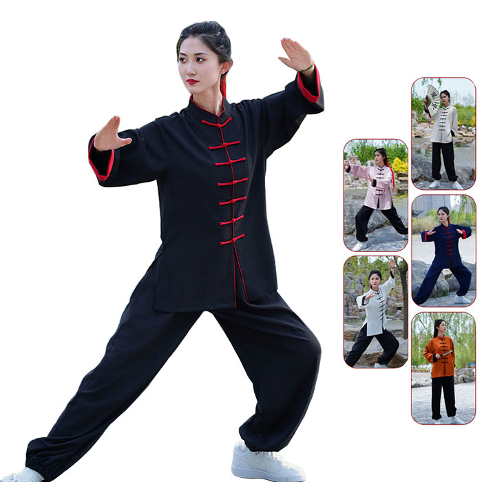 太極拳服 太極拳ウェア 上下セット 全6色 男女兼用 レディース メンズ 前開き 長袖 バイカラー カンフー服 中華風 スポーツ服 武術 チャイナボタン 練習着 表演服 気功専用ウエア 武術教室 演武