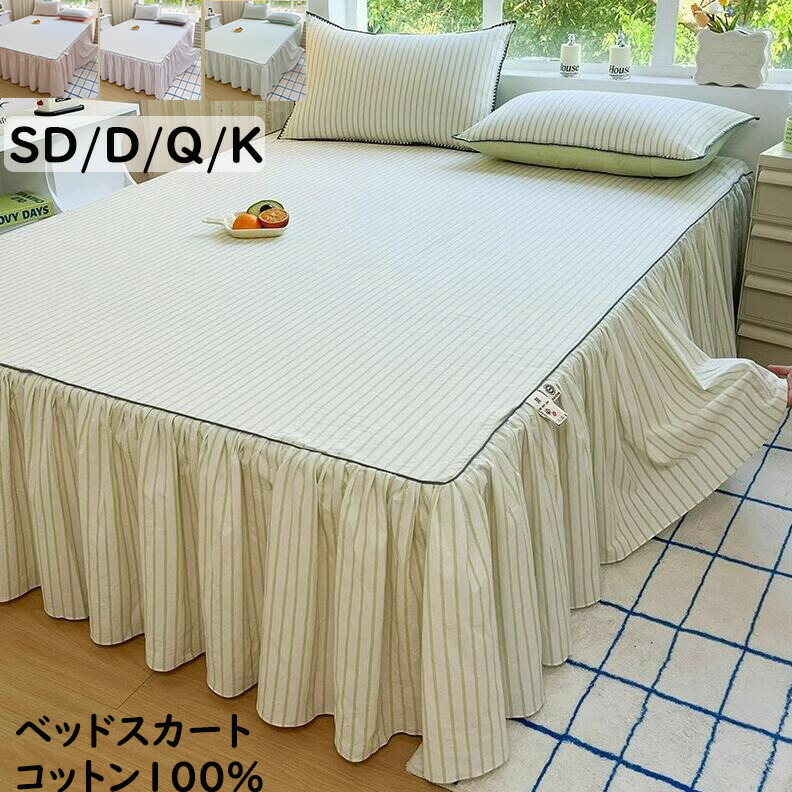 ベッドスカート 枕カバー コットン 綿100% 柔らかい ストライプ柄 北欧 セミダブル ダブル クイーン キング エレガント 上品 フリル マットレスカバー ズレ防止ヒモ付き 洗える ベッドカバー