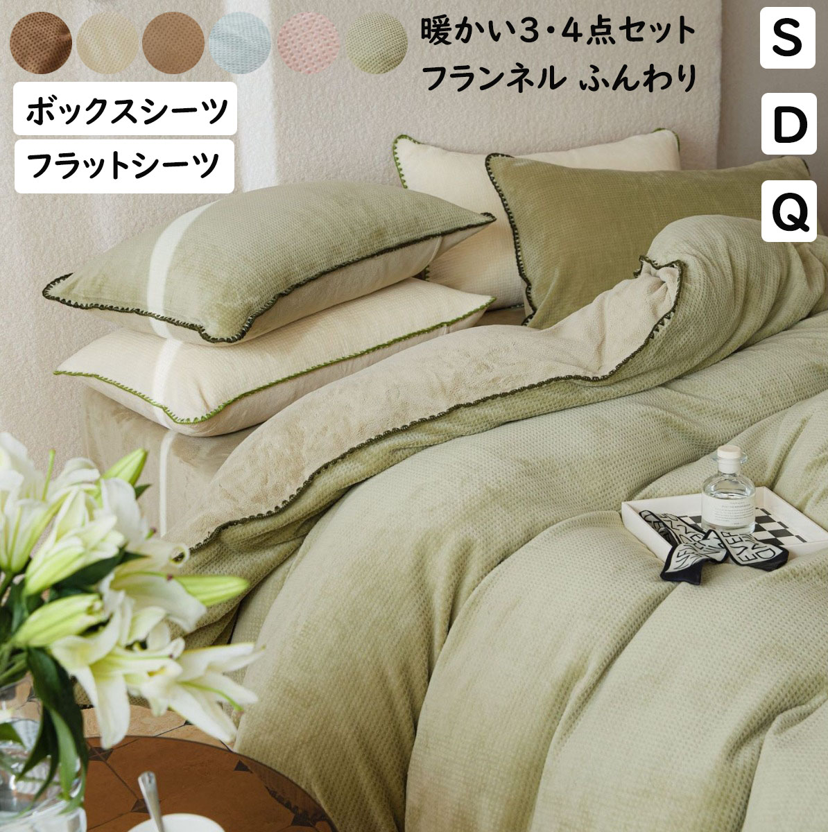 布団カバーセット ワッフル模様フランネル 暖かい ふわふわ 掛ふとんカバー3点セット 4点セット ボックスシーツ フラットシーツ 北欧 シングル ダブル 掛け布団カバー 枕カバー 寝具カバー クイーン