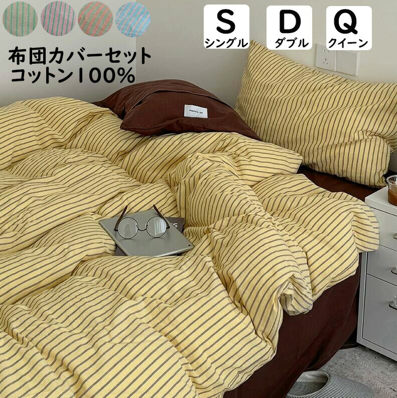 布団カバーセット 掛ふとんカバー3点セット 4点セット ストライプ柄 ボックスシーツ フラットシーツ 北欧 シングル ダブル クイーン 綿100% 優しい肌触り 柔らか 掛け布団カバー 枕カバ 通気性
