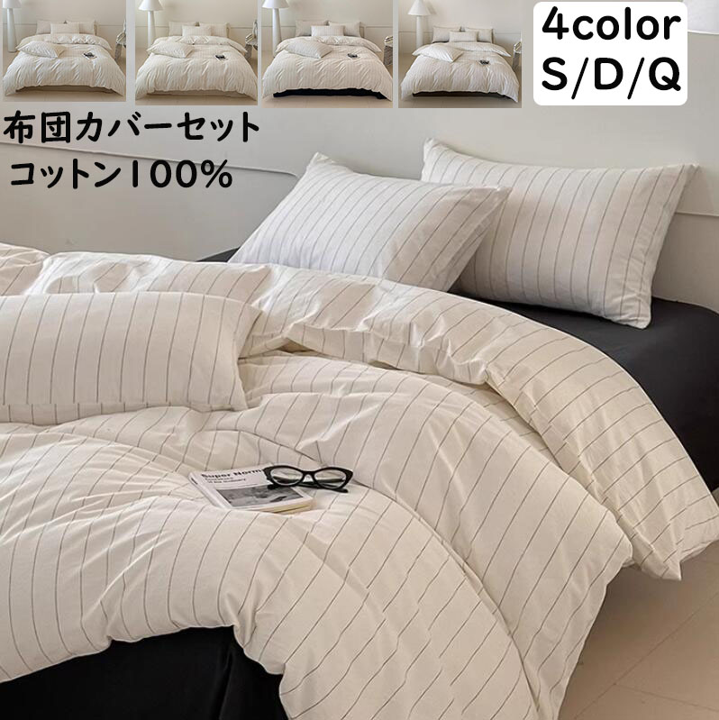 布団カバーセット 掛ふとんカバー3点セット 4点セット 黒 ストライプ柄 北欧 シングル ダブル クイーン ins風 綿100% 優しい肌触り フラットシーツ 掛け布団カバー 枕カバー ボックスシーツ