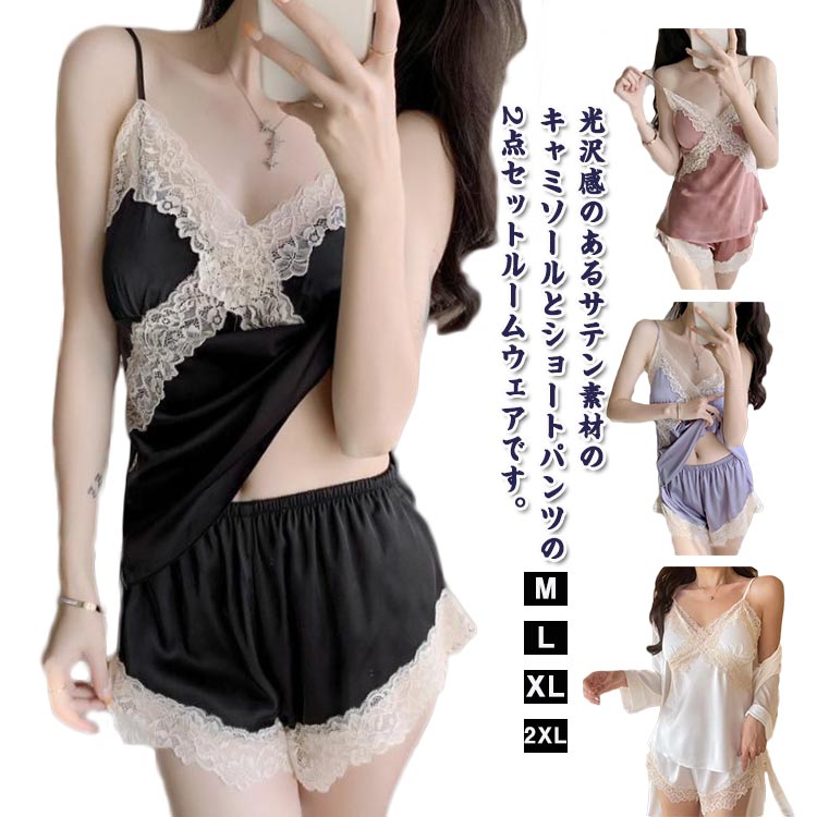 キャミソール ショーツ ルームウェア レース 上下セット ナイトウェア パジャマ 部屋着 ネグリジェ サテン