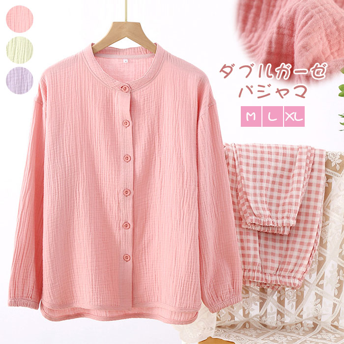 パジャマ ダブルガーゼ レディース ルームウェア 綿100% 部屋着 前開き 長袖 ロングパンツ チェック柄 クルーネック 上下 アップ 2点セット コットン 寝間着 シンプル ナチュラル 上下セット