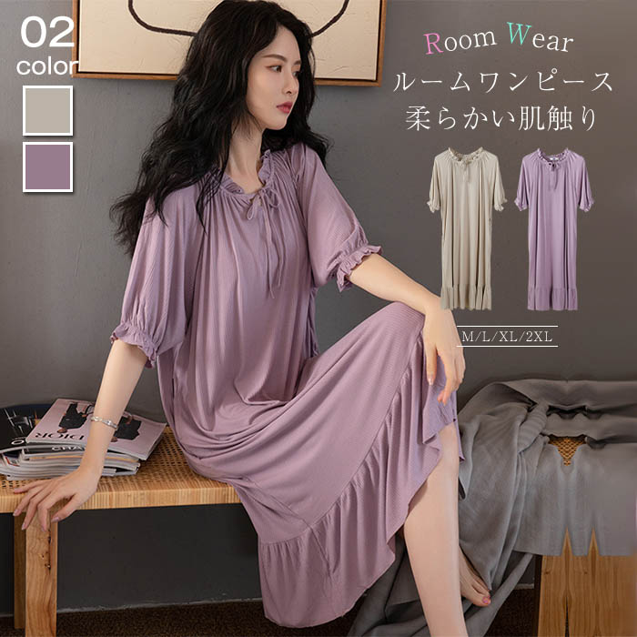 ルームワンピース パジャマ ネグリジェ ルームウェア 半袖 夏 ミモレ丈 レディース 柔らか オフショルダー モダール綿 伸縮性 部屋着 ナイトウェア 大人 寝間着 フェミニン セクシー エレ 通気性