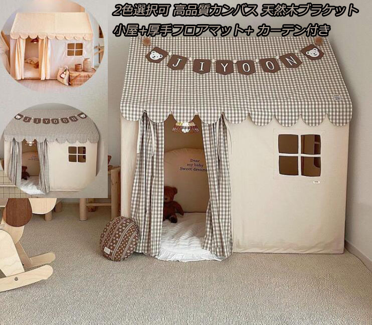 4点セット キッズテント 子供部屋 プレゼント 子供テント キッズ プレイテント 組み立て簡単 室内室外 小屋+厚手フロアマット+ カーテン付き 天然木ブラケット 窓つき 通気性 扉つき