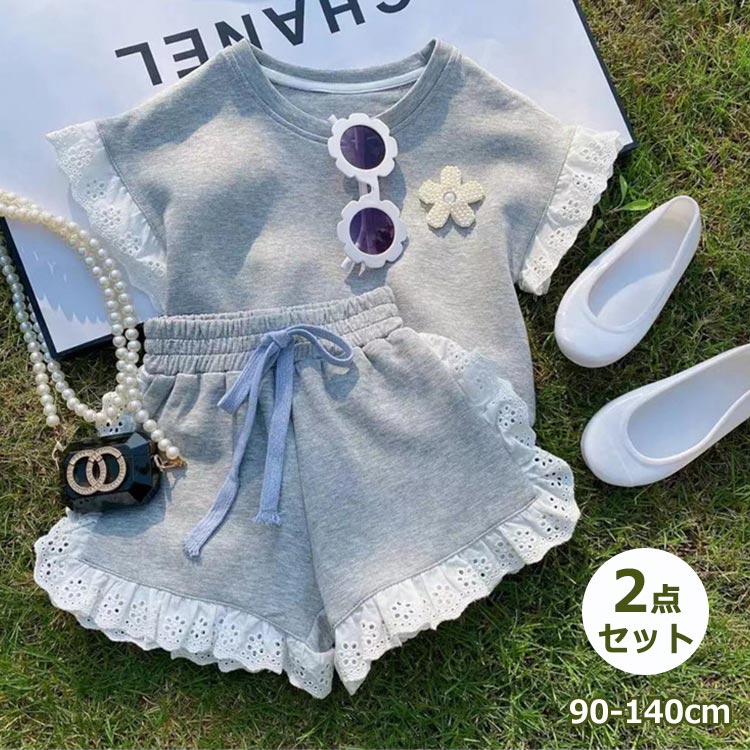 女の子 セットアップ 夏用 半袖 2点セット Tシャツ ズボン 上下セット かわいい レース 子供服 夏服 カジュアル 普段着 通学着 子ども服 ガールズ 通気性 韓国子供服 キ ファッション