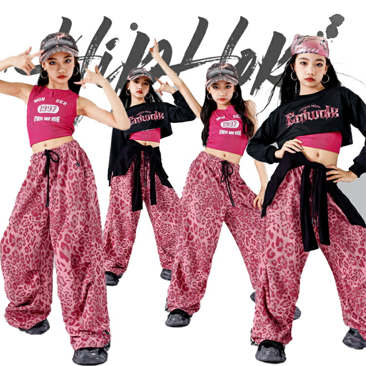 ピンク系 子供服 キッズ ヒョウ柄 ダンス衣装 女の子 ガールズ 長袖 単品orセット タンクトップ へそ出し 長ズボン ダンスウェア 発表会 応援団 イベント カッコイイ 普段着 jazz ジュニア