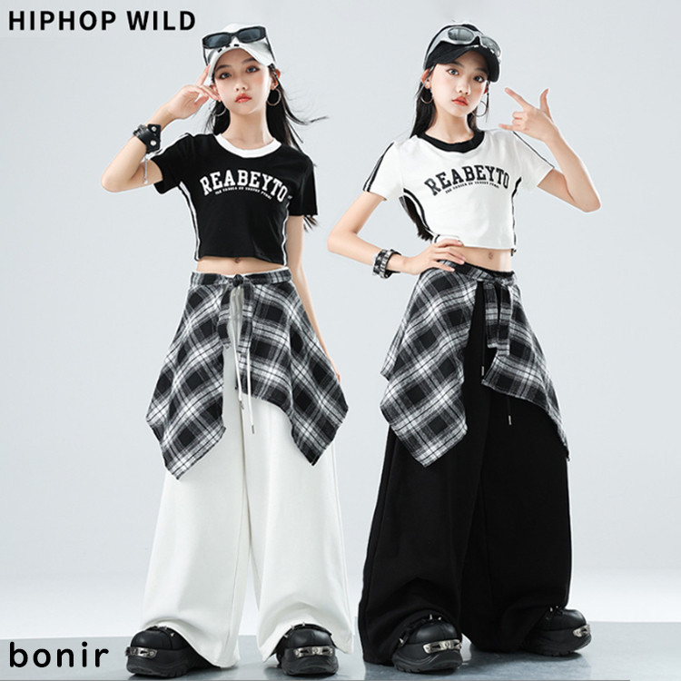 キッズ ダンス衣装 ヒップホップ 黒 白 モノトーン 字母柄 半袖 へそ出し クロップド Tシャツ ワイドパンツ チェック柄 腰巻き Y2K 子供服 演出服 ダンスウェア 発表会 応援団 団体 女の子