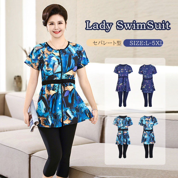 レディース 水着 シニア セパレート 2点セット ワンピース水着 フィットネス水着 七分丈パンツ 体型カバー タンキニ ロング丈 スパッツ 大きいサイズ 半袖 花柄 ママ 中高年 温泉 お母さん 保守