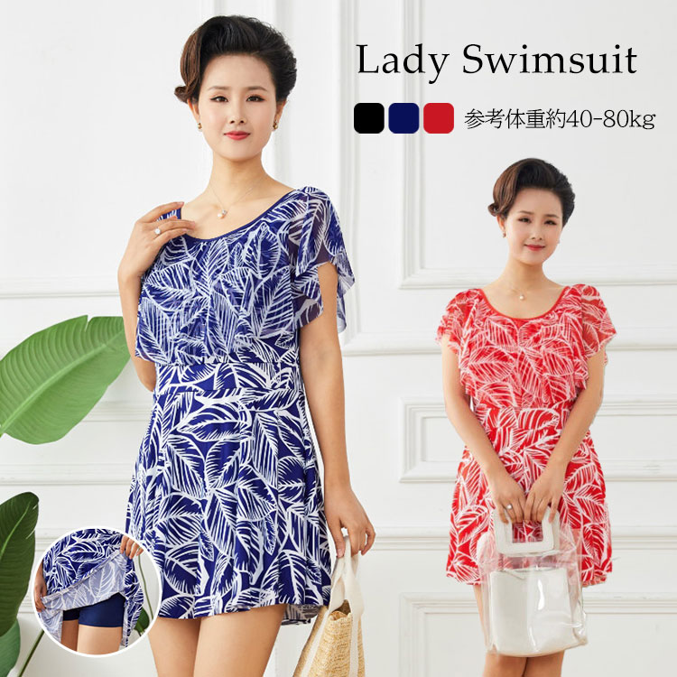 ママ水着 シニア 水着 レディース ワンピース 40代 50代 60代 体型カバー 大きいサイズ スカートパンツ一体型 半袖 保守 中高年 温泉 お母さん スイムウェア ブルー ビーチ 旅行 海