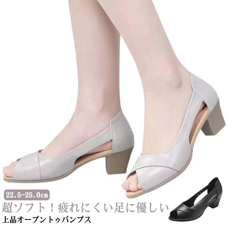 オープントゥ パンプス ローヒール 通勤 レディース 立ち仕事 美脚 脚長 柔らかい 歩きやすい 痛くない