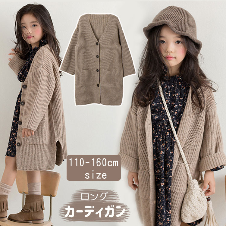 ロング丈 カーディガン 女の子 キッズ ジュニア 長袖 ニットセーター アウター 無地 大きいサイズ 学生 カジュアル ガールズ 重ね着 コーデ 秋 冬 シンプル かわいい 大人らしい 通学 おしゃれ