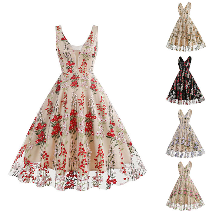 レトロドレス レディースワンピース ノースリーブ Vネック Aライン フォーマル 刺繍ドレス 花柄 袖なし フレアドレス パーティー ドレス レトロ ワンピース 発表会 刺繍ワンピース きれいめ 舞台