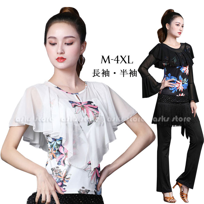 レディースダンストップス 半袖 長袖 フレア袖 胸元フリル シースルー 花柄 社交ダンス衣装 トップス レッスン着 競技着 ラテンダンス バレエ モダンダンス フラメンコ ダンスウェア 練習着 ワルツ