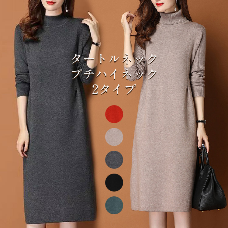 ニットワンピース ニット ワンピース 秋冬 ハイネック 膝丈 ロングワンピース ニットワンピ Aライン ゆったり 体型カバー チュニック 長袖 タック タートルネック カジ ウェストタック入り